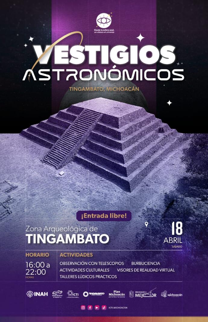 Morelia, Michoacán, 15 de abril de 2026.- El Instituto de Ciencia, Tecnología e Innovación (ICTI), en coordinación con el Instituto Nacional de Antropología e Historia (INAH), realizará el evento “Vestigios Astronómicos” en la Zona Arqueológica de Tingambato, el próximo sábado 18 de abril.